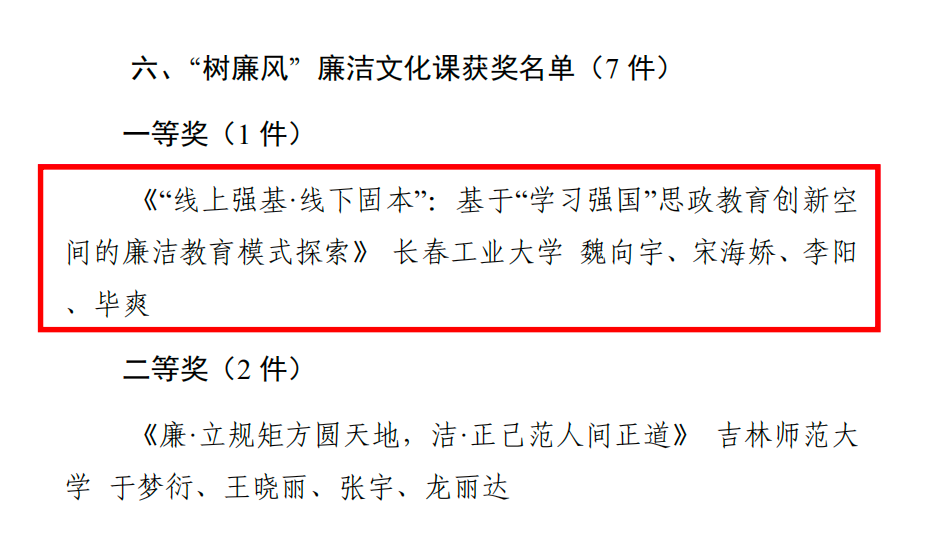 在学校党委领导下,在学校纪委的指导和支持下,积极响应、迅速部署,立足教学科研本职,结合马克思主义理论学科优势,精心打磨作品,形成了良好的创作氛围。魏向宇、宋海娇、李阳、毕爽等老师报送的《“线上强基·线下固本”:基于“学习强国”思政教育创新空间的廉洁教育模式探索》获得“树廉风“廉洁文化课一等奖;于浚湜、杨慧娇、朱建一、魏向宇等老师报送的《数字守节·清朗网络观的“道”与“术”》获得“青廉说”廉洁微网课三等奖。